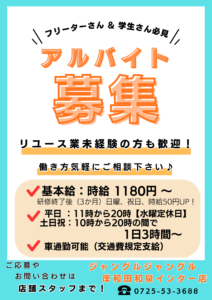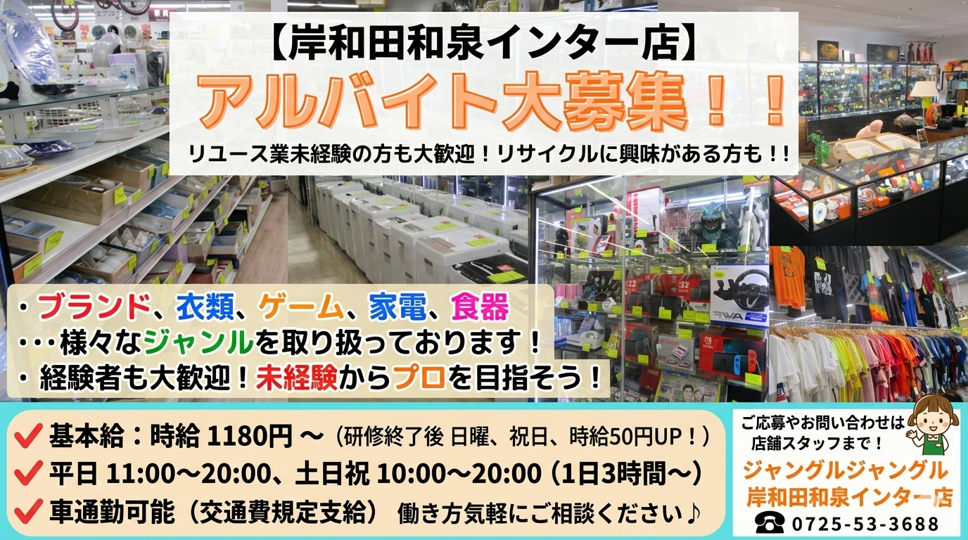 皆様、こんにちは!ジャングルジャングル 岸和田和泉インター店です。 ただいま当店では、お店を一緒に盛り上げてくれる新しいスタッフを大募集しています!