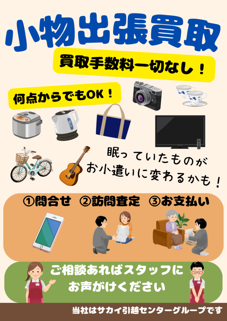 ②基本的にはトラック(店名は入っておりません)で回っておりますので、ご安心ください。見積金額にご了承いただけましたらその場でお支払いし、持ち帰らせていただきます。引っ越しなどで事前に見積りだけが希望の場合には先にお伝えください。